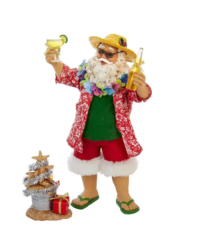 This 10″ Fabriché™ beach Santa set of 2 pieces is a fun and festive addition to any holiday décor! Santa Claus is featured here ready for a day at the beach . He is wearing a sun hat, sunglasses, and a tropical shirt (with white-trimmed red shorts, of course). He has a margarita in one hand, a beer in his other hand, and a sand Christmas tree at his feet!
