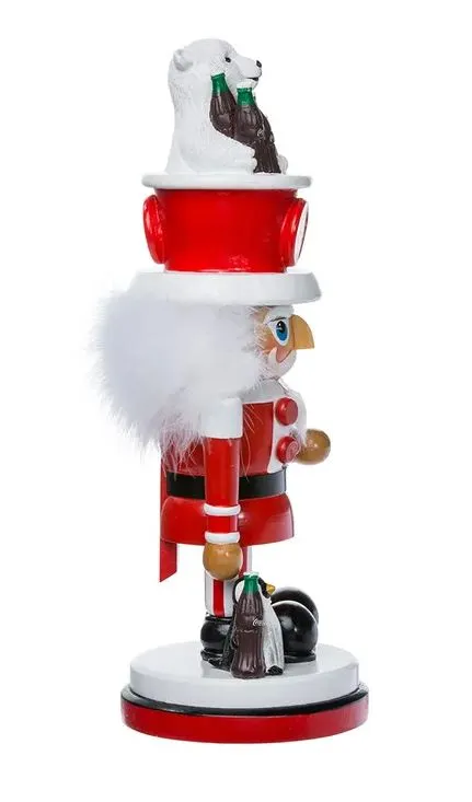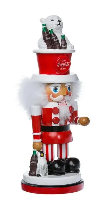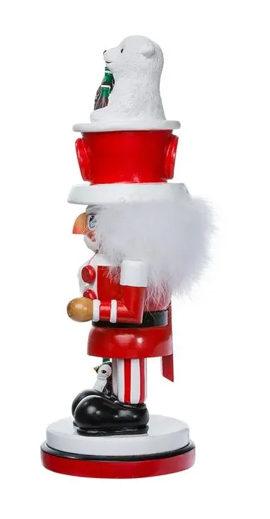 The perfect bit of holiday cheer for the Coca-Cola collector! This Kurt Adler 15″ Coca Cola Hollywood Nutcracker with Polar Bear Hat is fun and festive! This classic wooden soldier is handsomely dressed in a bold red and white uniform. On top of his fluffy white hair, he is wearing a Coca-Cola bucket for hat that holds a Coca-Cola polar bear with a few icy bottles of his favorite drink. Standing at his feet, is his little penguin buddy. This charming piece combines Christmas tradition with classic Coke style, making it an excellant addition to any collection!
