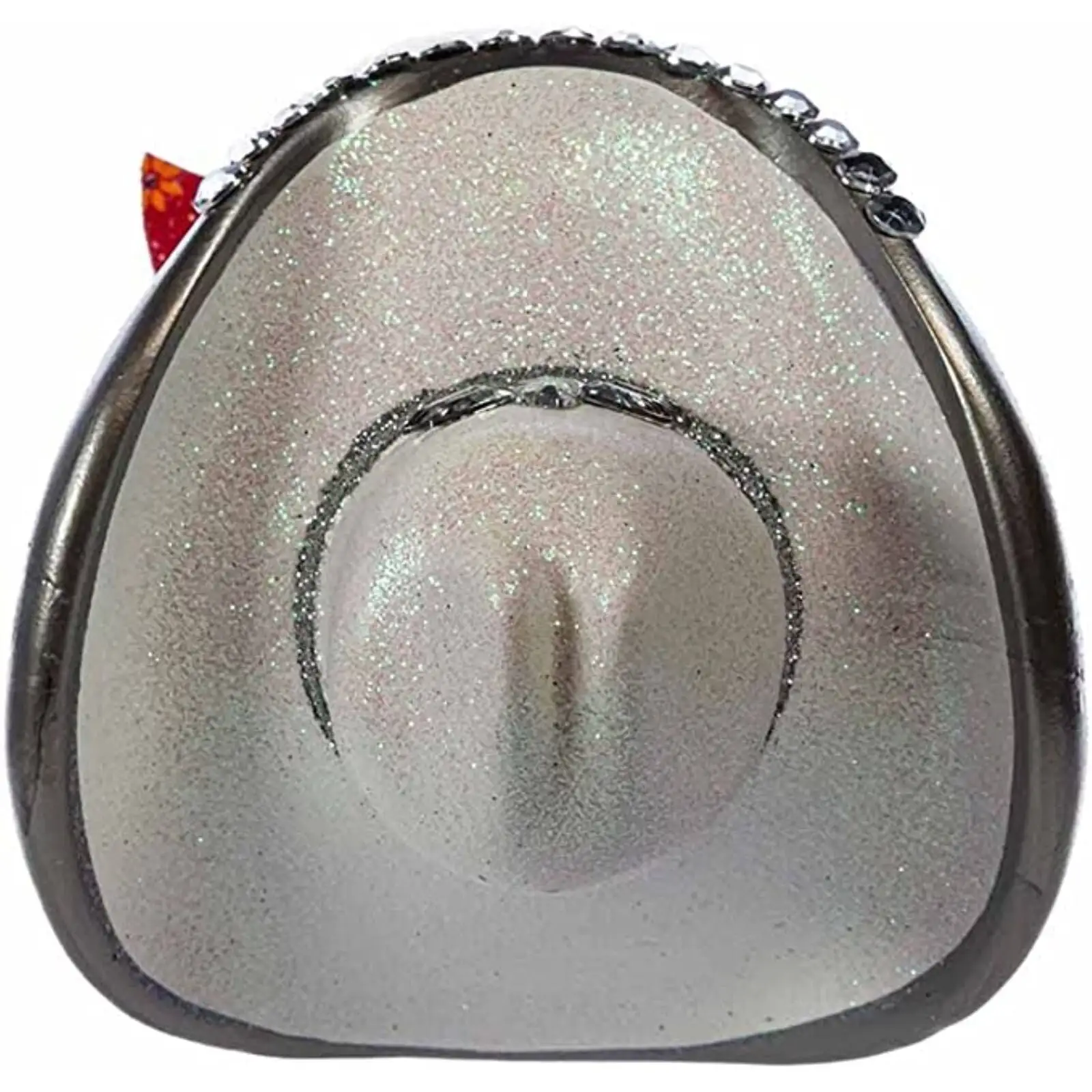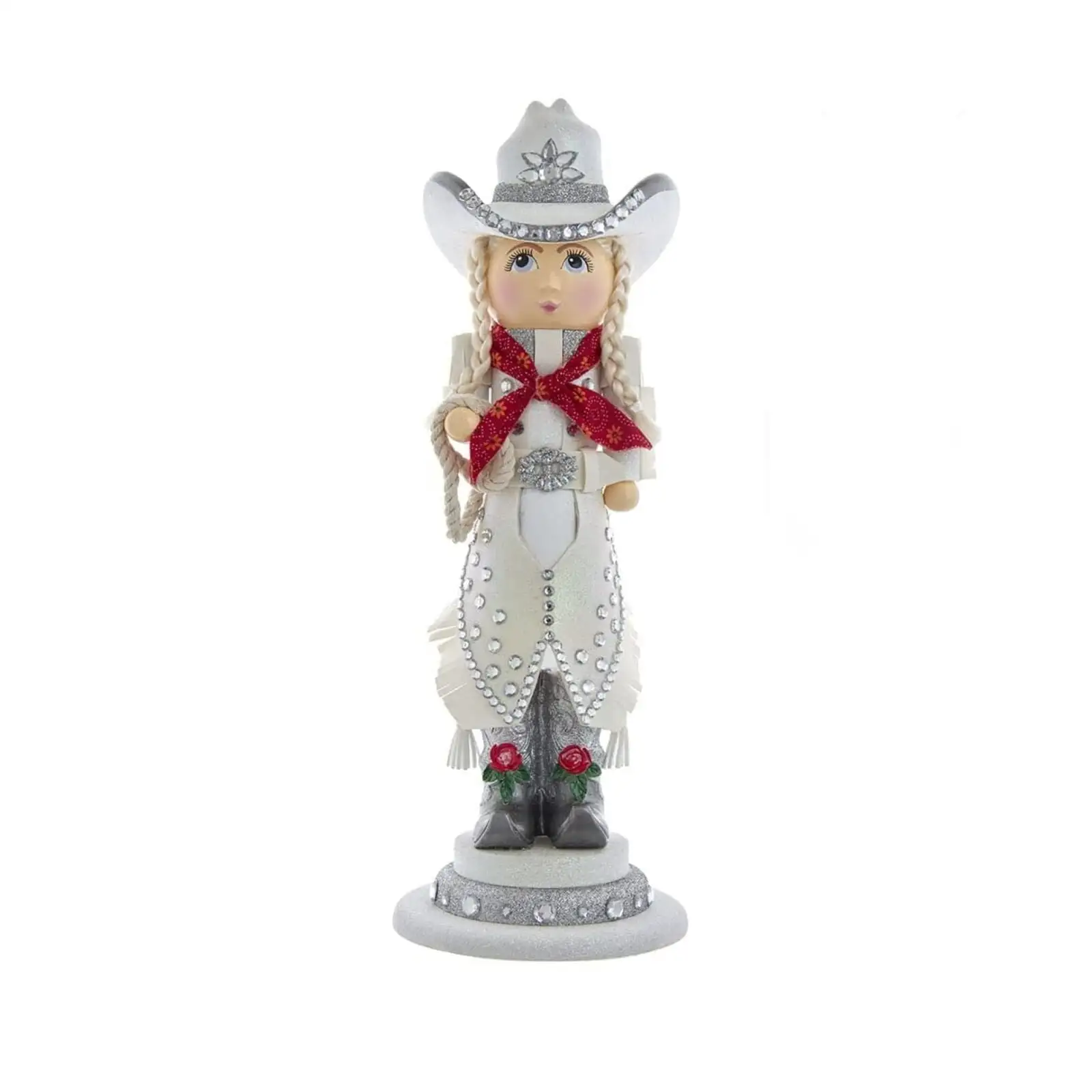 This 18-inch rhinestone cowgirl nutcracker features a cowgirl wearing a white western inspired outfit with silver boots, a red bandana and a white and silver glittered cowgirl hat. Her outfit is decorated with clear gemstones and she is carrying a rope in her right hand.