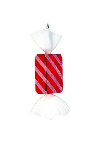 These shatterproof ornaments are designed like wrapped round candies with white glitter stripes around the centers for a touch of sparkle.