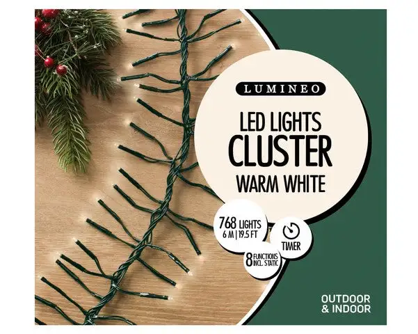 One major advantage to using LED Christmas lights is their life span and low power consumption. This means you can keep using your Christmas lights for years to come. Warm white Cluster light string on green wire with 8 different twinkle functions featuring 768 LED lights.