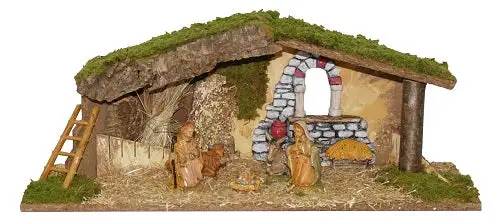 According to the Gospels’ traditional narrative, Jesus was born in a stable or in a grotto and put in a manger where an ox and a donkey would keep him warm ; an extraordinary light, never seen before, would shine brightly. this is what the light in the stable stands for.