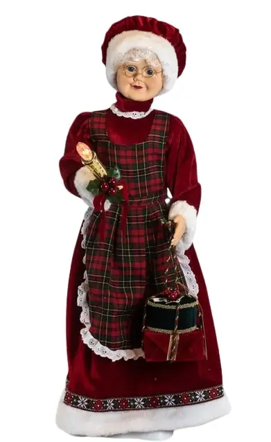 This Animated Mrs. Claus is full of traditional Christmas charm! She is wearing a red velvet dress & hat trimmed in white faux fur white and her plaid apron. A lighted candle in her right hand, a her tote in the left. Perfect to add to any room in your home that needs a little bit of holiday cheer.