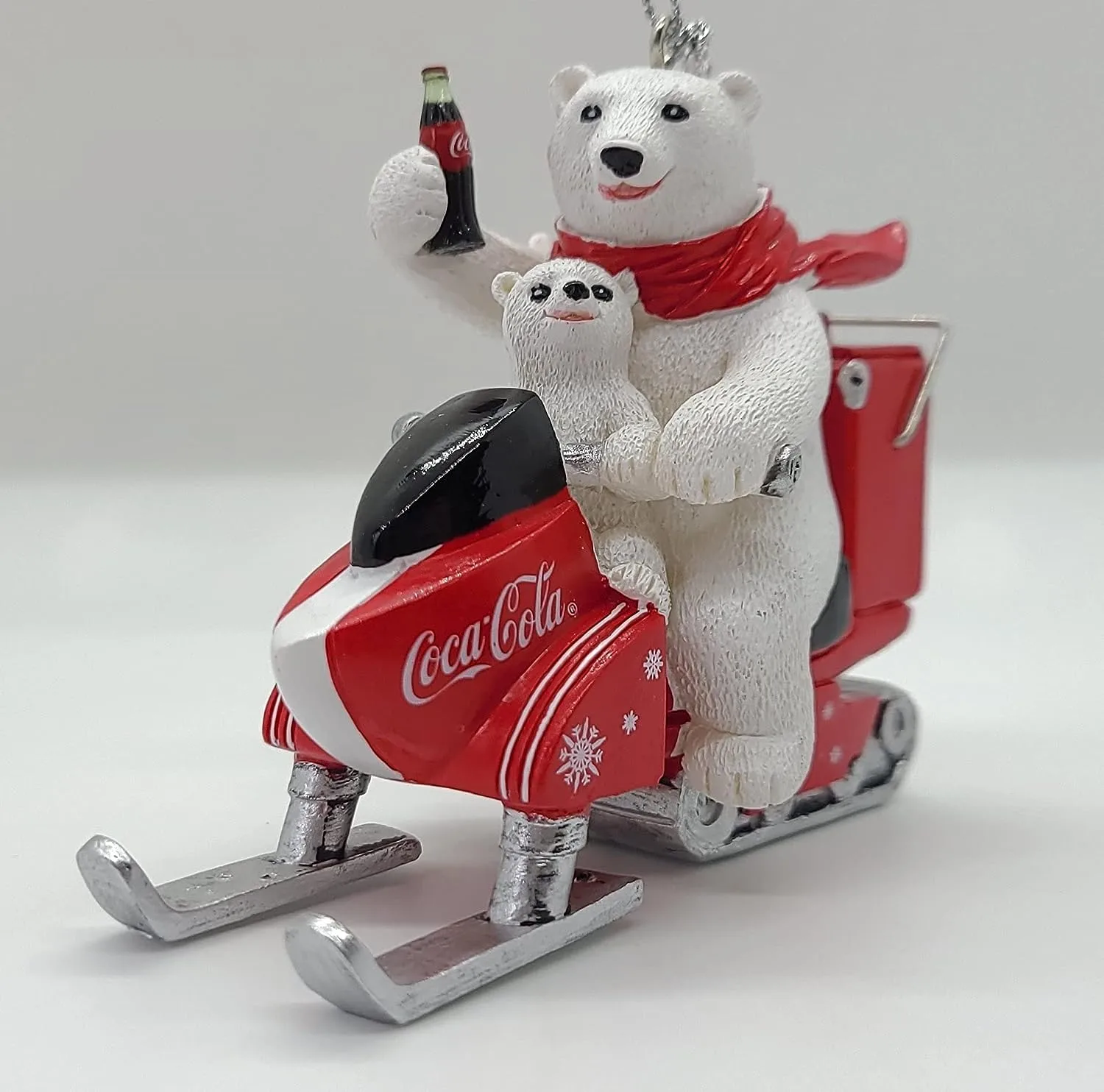 Cherish the iconic Coca-Cola polar bear with a special 3″ figurine! The classic white bear is perched atop a snowmobile and wearing a chic red scarf, with the cub by its side. Enjoy the details of the unique silver and red Snowmobile for a unique touch. An item to treasure forever!