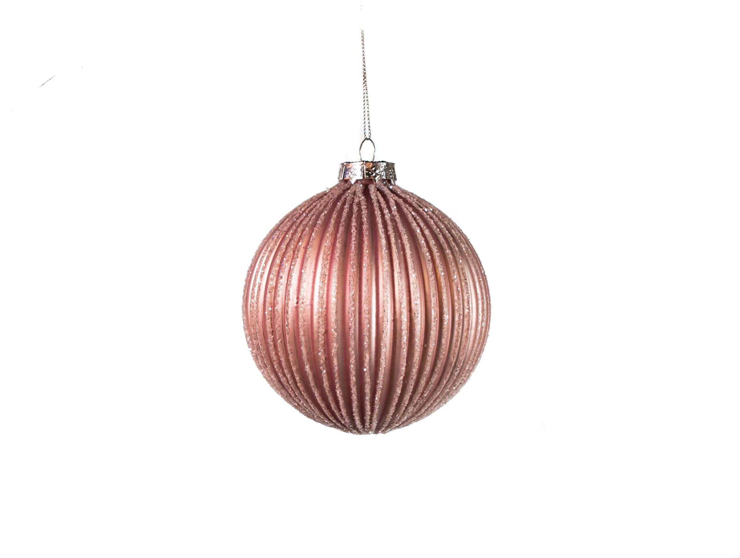 These blush pink ornaments are encircled with ridges adding texture and depth to any of your holiday designs. Each ridge is accented with silver glittering to help catch the eye of all your guests.