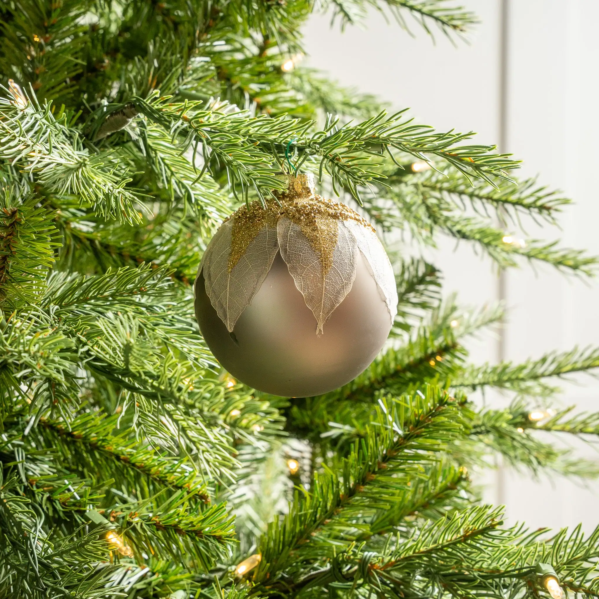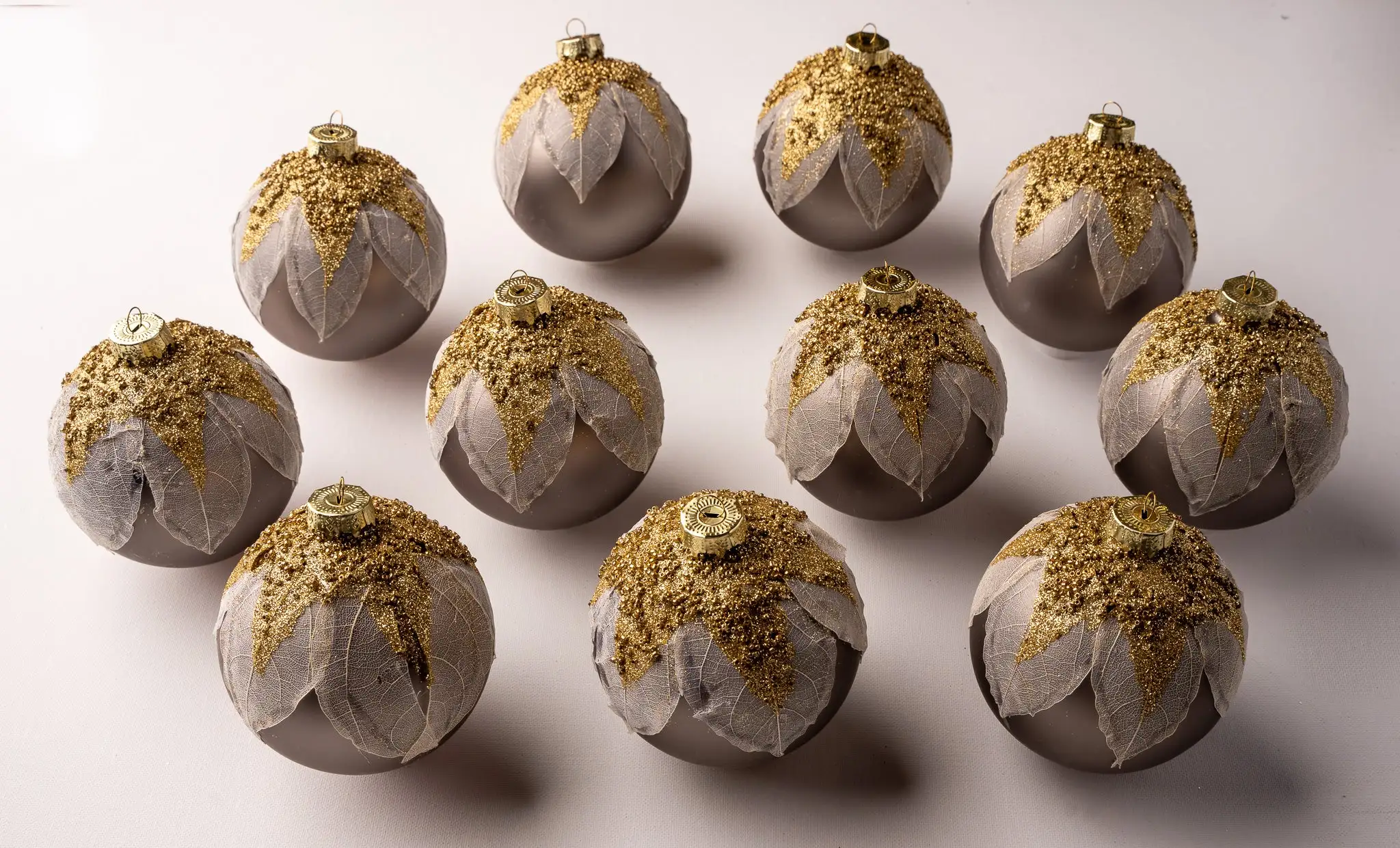 4″ Champagne Sequin Leaves & Grey Ball Set Of 12