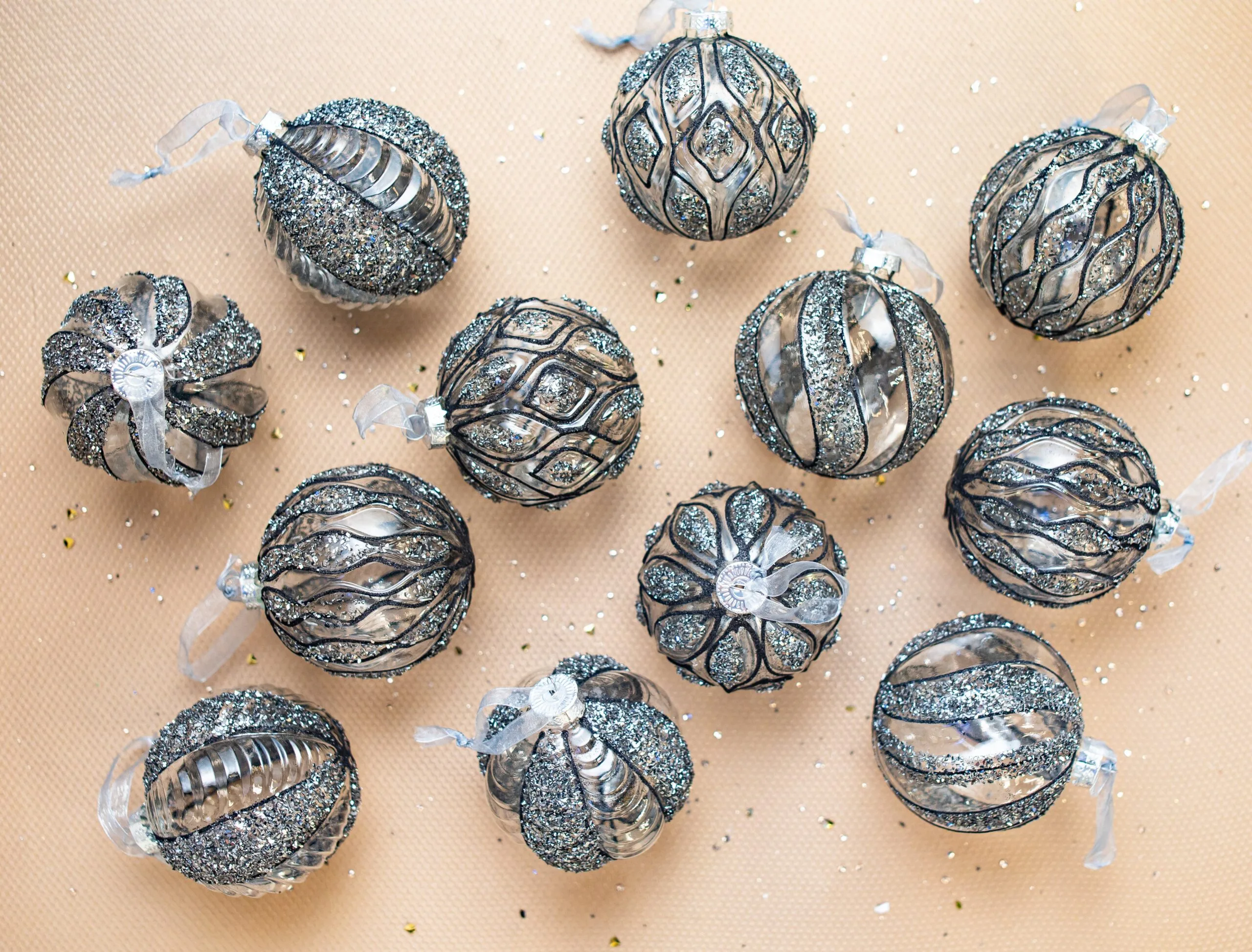 Add a whimsical touch to your decor with these captivating clear glass ornaments adorned with silver and back glittered designs.