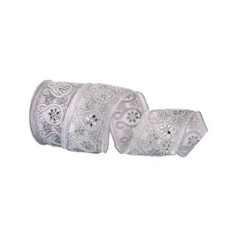 This beautiful ribbon combines luxury and grandeur in the most opulent fashion. It measures 4″ X 10 yds and features a wired, sheer, white ribbon with an intricate design of shimmering silver threads. The rich fabrics are further embellished with sparkling silver gems, mirrored beads, and creamy pearls. Sewn wire edged ribbon allows you to bend and shape your creations to decorate with ease, making it perfect for decorating Christmas trees, wreaths, or gift accenting. Made in true designer quality, and crafted from the finest materials, this gorgeous ribbon is sure to give your Christmas decor a touch of sophisticated elegance!
