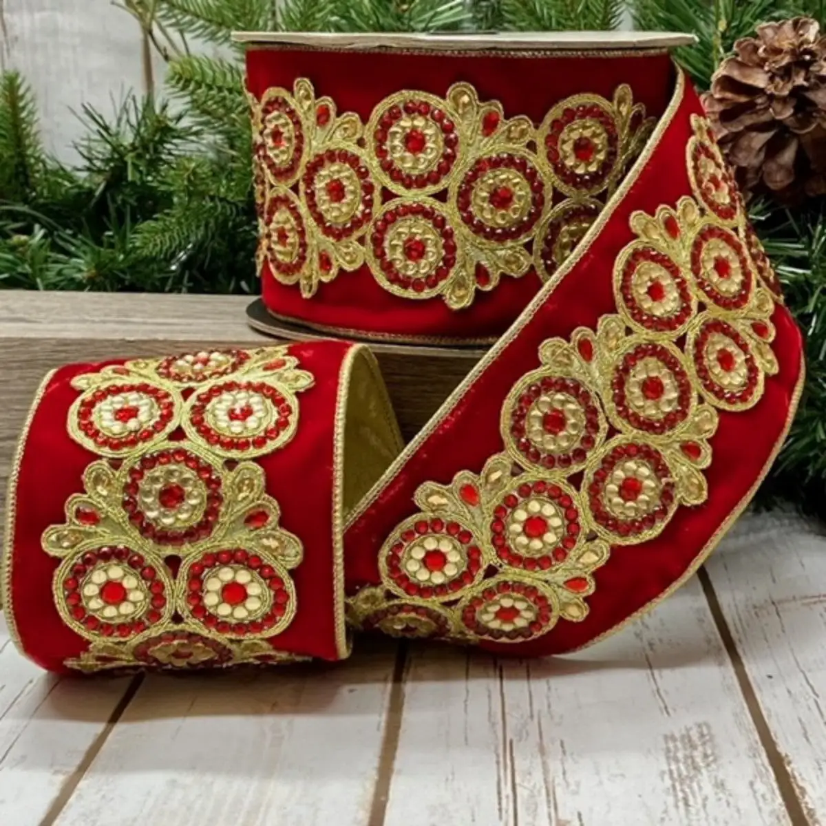A wonderful and elegant ribbon. This velvet circular jeweled ribbon is perfect for adding some texture to wreaths, garland, gift wrap & more. An ideal embellishment for Christmas decorations. It has a wired edge so your bows will hold their shape all season long.