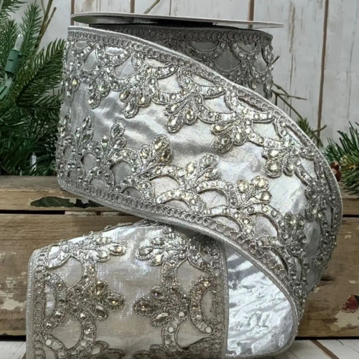 This beautiful ribbon combines modern luxury and tradition in the most opulent fashion. It measures 4″ X 5 yds and features a wired, fabric ribbon in a soft silver color under a shimmering scallop design. The rich fabrics are further embellished with sparkling silver gems. An absolutely stunning ribbon that is sure to give your Christmas decor a touch of elegance!