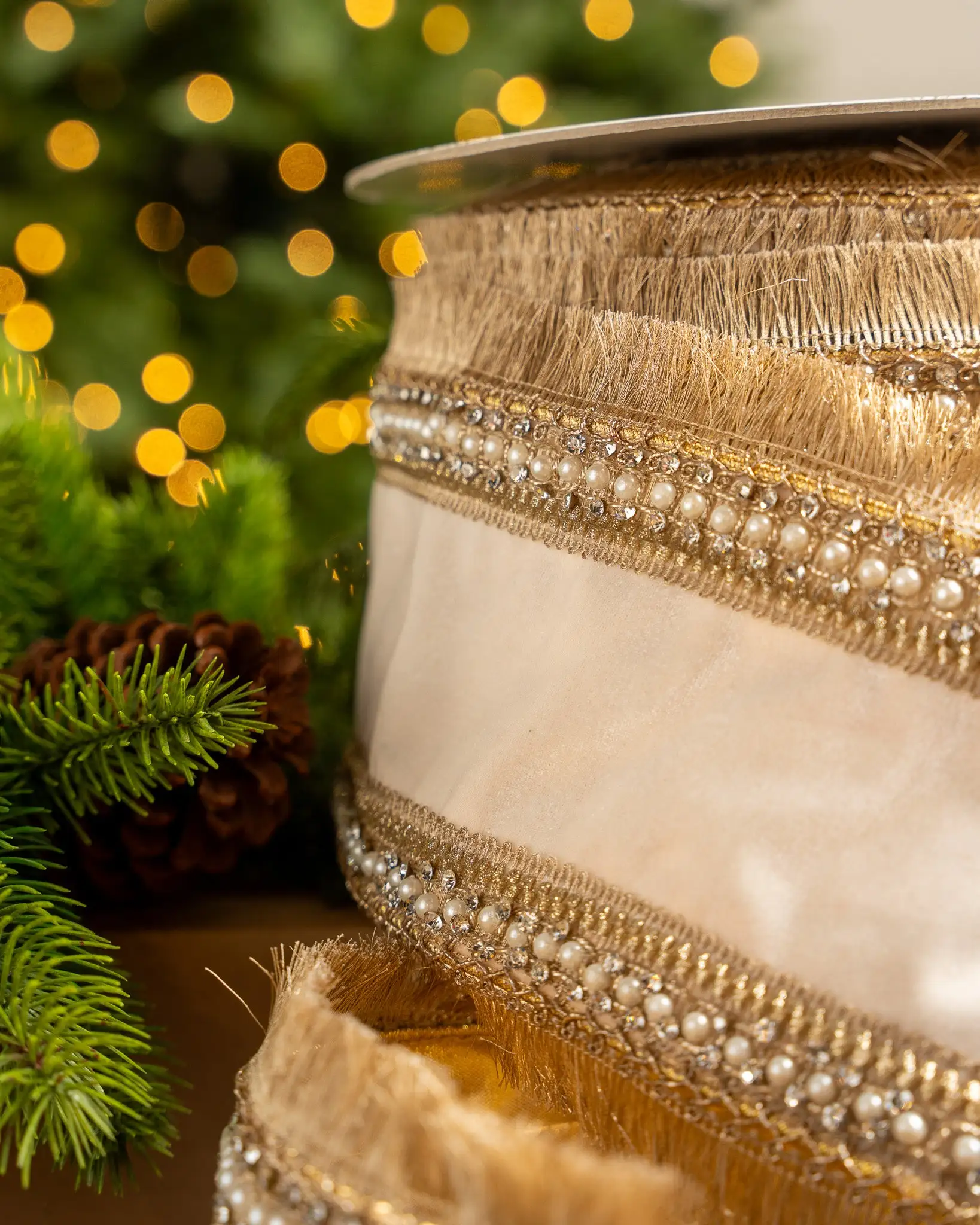 Add some sparkle and elegance to your Christmas tree this year with our 4″ X10YD White Ribbon With Pearled Silver Lattice. This beautiful ribbon features a delicate silver lattice design with shimmering pearls that will catch the light and create a stunning backdrop for your favorite ornaments. Made from high-quality materials, this ribbon is durable and easy to use, making it the perfect addition to your holiday decorations. Whether you’re looking to create a classic, elegant look or something more contemporary and chic, this ribbon is versatile enough to suit any style. So, why wait? Order now and transform your Christmas tree into a winter wonderland!