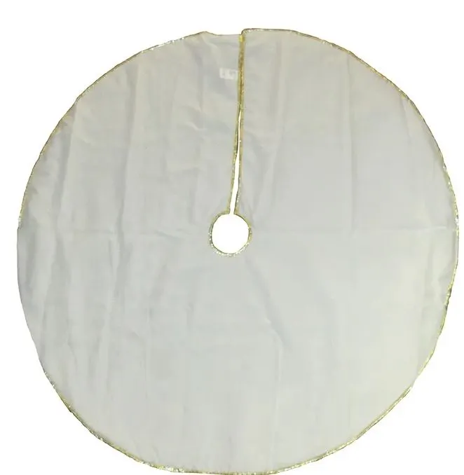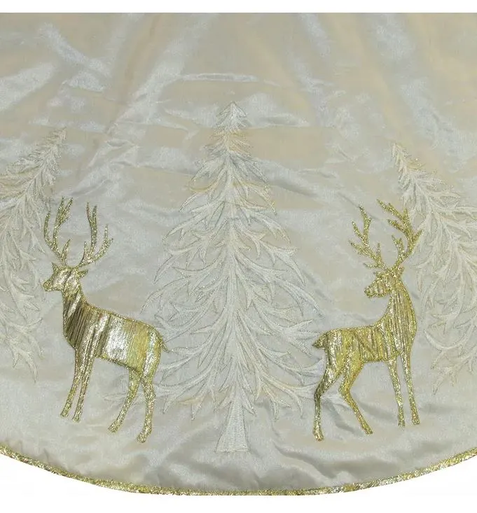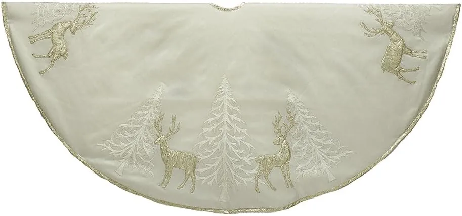 This Kurt Adler gold tree and reindeer applique tree skirt is a beautiful, festive way to add to the dรฉcor of your Christmas tree! The round tree skirt comes in a satin-finish cream fabric and features metallic soft gold piping and reindeer appliques.