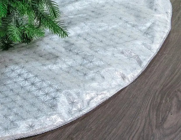 Spruce up your Christmas tree this season with this metallic silver and white tree skirt. A metallic silver center comprises this skirt with unique designs. Create delightful glee with your friends and family with this perfect tree skirt!