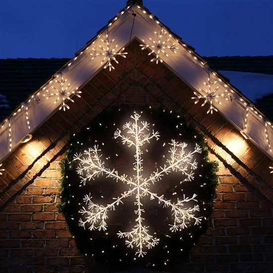 Impressive from every angle! Twinkling LEDs set this snowflake apart. A three dimensional snowflake that features our LED Sparklers. Match them up or mix with classic white Snowflakes. The next level of Holiday decorating. Both elegant and gorgeous. No one will miss this one! The branches of this snowflake are white with classic white lights. Available in two LED colors and three sizes.This product is bright and beautiful. Contains a total of 960 brilliant LED lights. Perfect oversized, twinkling decor on white branches. Make a statement with this snowflake today.