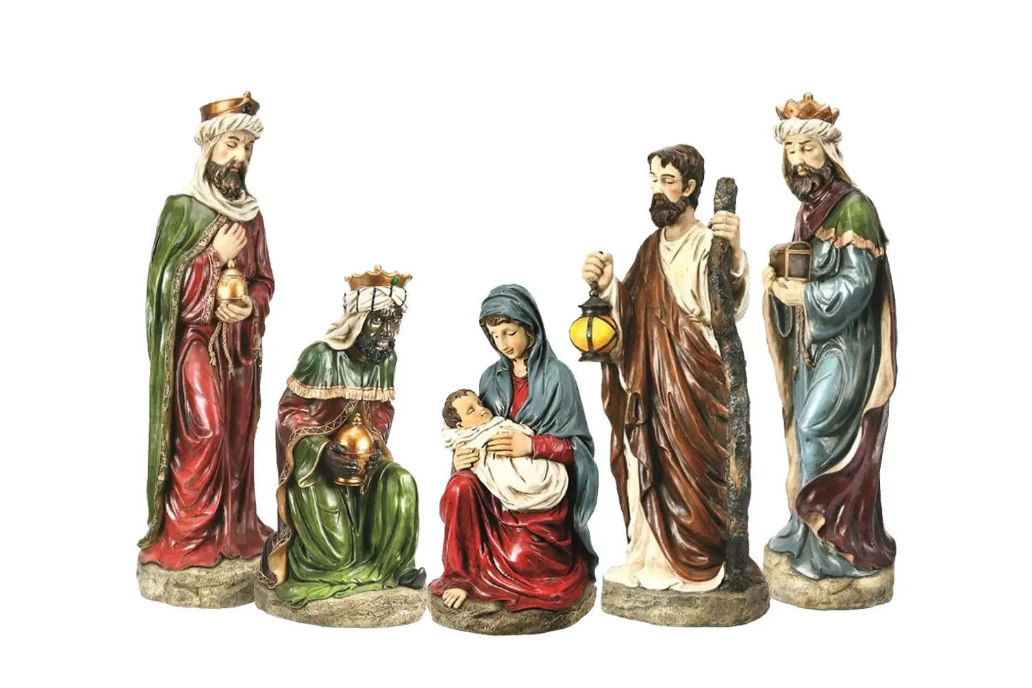 A lovely tribute to the birth of Jesus this large outdoor nativity features 5 pieces with deep colors and intricate detail. Set includes Joseph, Mary and Baby Jesus, & The three kings.