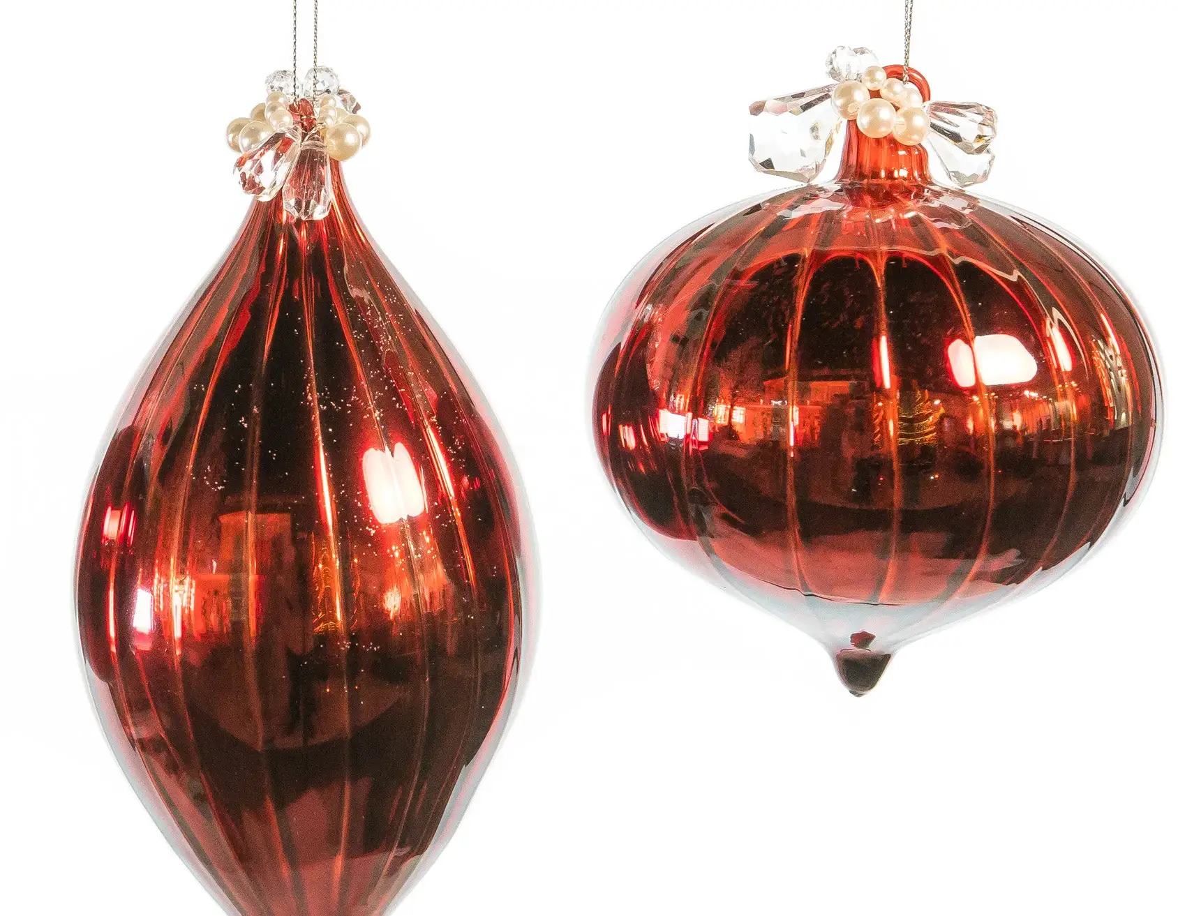 Add these stunning crimson toned assorted ornaments to your holiday decor this season. They feature a unique style with crystal drops at the very top.