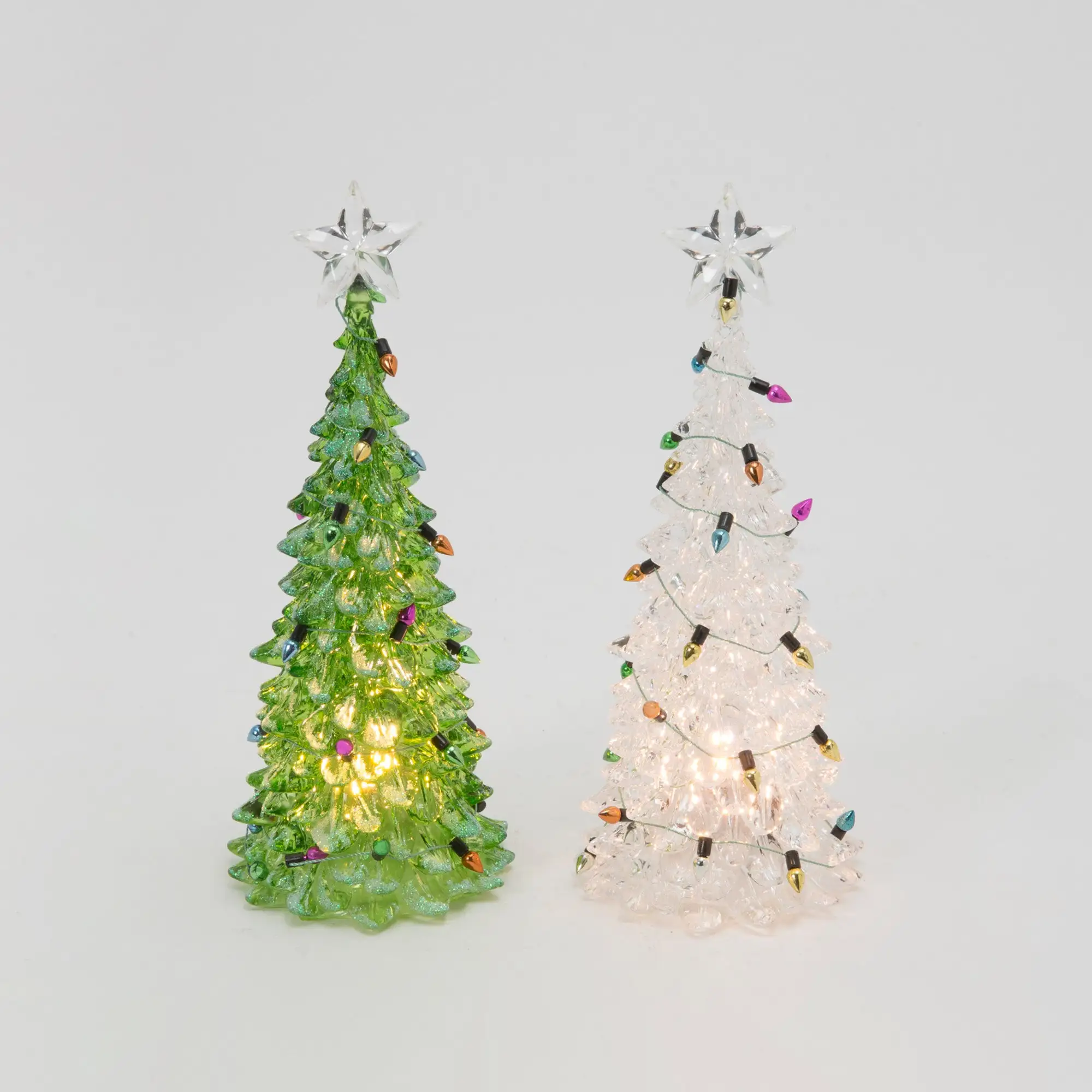 Bring a warm, festive glow to your home with this set of two charming 7.8″ battery-operated water globe lighted trees. The white and green hues are illuminated by long-lasting LED bulbs, giving your home a cozy holiday atmosphere. Enjoy delightful ambiance with no electric wires or outlets!