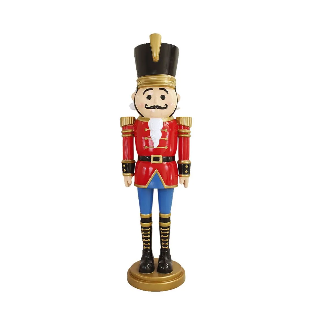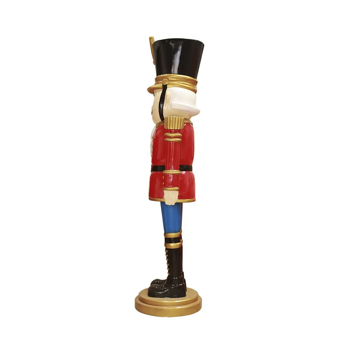 This handsome nutcracker soldier is a Christmas classic. He is smartly dressed in a festive uniform of bright red and blue with shiny gold accents and trim. He proudly stands at attention wearing shiny black boots and hat. He measures an impressive 9′, making him ideal for large displays and commercial use. Full of traditional holiday charm, he is sure to give your Christmas decor a touch of regal sophistication and elegance!