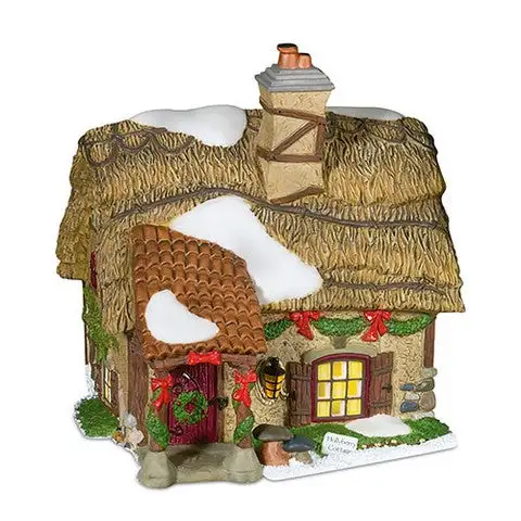 A thatched roof makes this a special piece. This lighted porcelain residence was designed to accompany Dickens Village by Department 56.