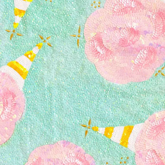 Add an extra layer of sweetness to your holiday with this luxurious cotton candy themed tree skirt. Featuring glass beading, sequins and a mop flop trim all on a a rich velvet fabric. This tree skirt is sure to be a family favorite for years to come.