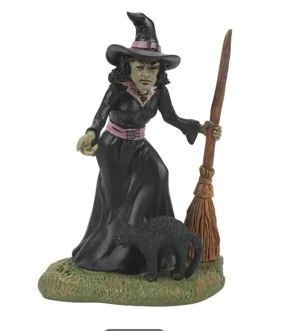 This very traditional witch, dressed all in black with her black cat, broom stick and pointed hat, is a spooky addition to your Halloween display. You can almost hear her chanting, Toil, Toil Double Trouble.