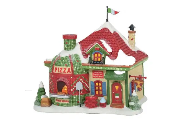 With a colorful “stone” pizza oven out front, The North Pole Pizza will be to “go to” place for all the elves. Lots of details, including a colorful flag with a nod to Italy, home of pizza and a pizza slice hanging sign just outside the door.