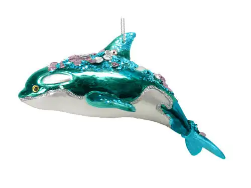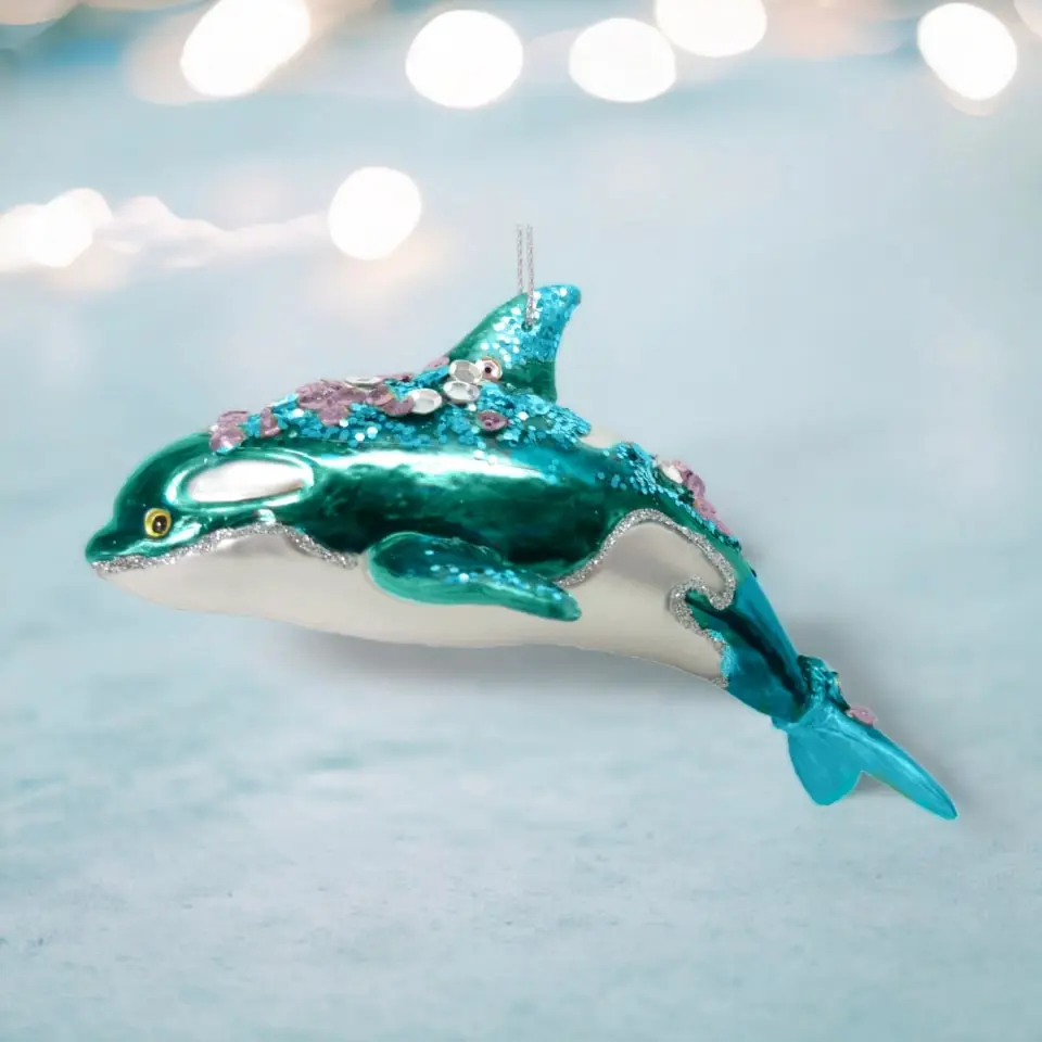 Light up your holiday space with this dazzling Sequin Dolphin Ornament! It features a beautiful teal glass colored dolphin, topped with glitter accents that sparkle and shine. Bring shimmer and joy to your festivities with this unique, eye-catching ornament!