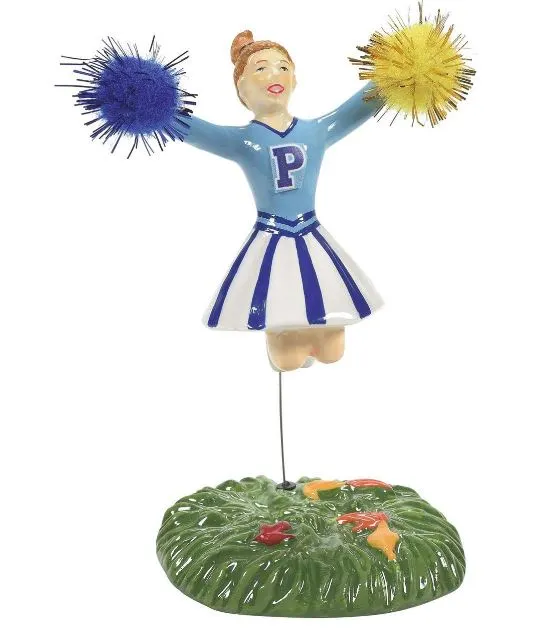 Goooooo TEAM! This cheerleader is dressed in her blue outfit with a gold and blue pompom in hand, she’s jumping mid-air and cheering on her team at the homecoming game!