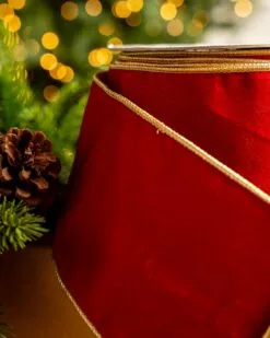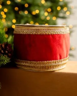 4″ X10YD Red Velvet Ribbon With Gold Crotchet Trim