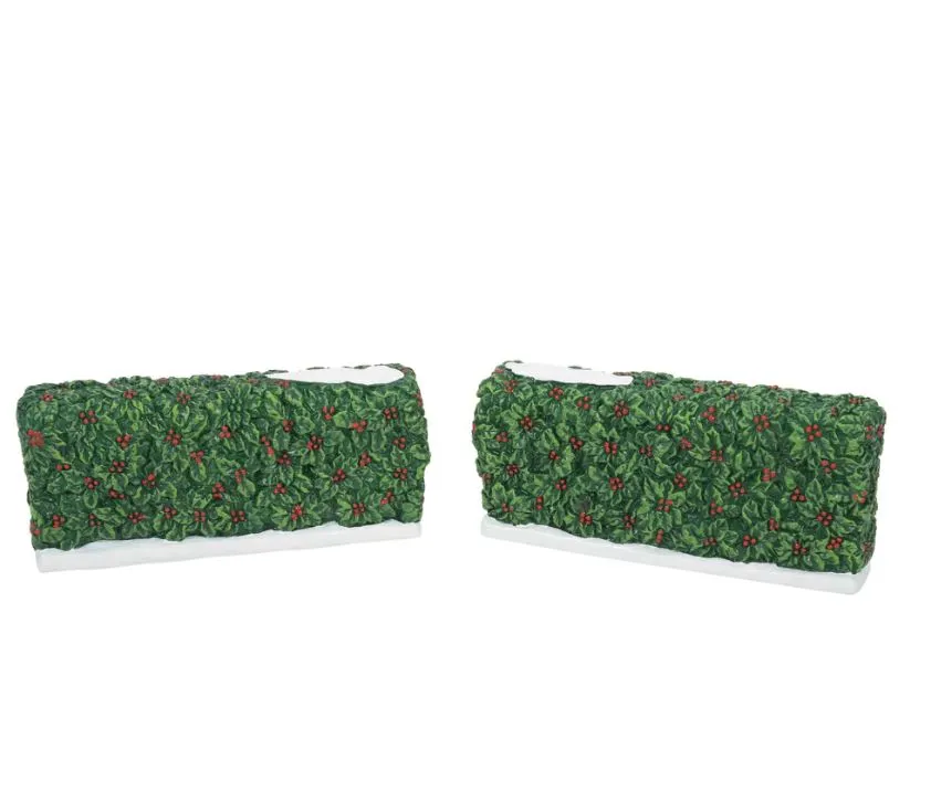 Any Christmas village could use some finishing touches with trees and pieces of greenery like the Holiday Holly Hedges by Department 56. Made from polyresin, this well-detailed set includes two figurines. Each one depicts a green hedge made of holly. It has many small red berries. There is a base of snow at the bottom of each hedge. Also, a small patch of snow adorns the top of each box-shaped hedge. This set looks great in a winter landscape display. You can easily add the holly hedges to any mini holiday village. This hand-painted set is made by Department 56.